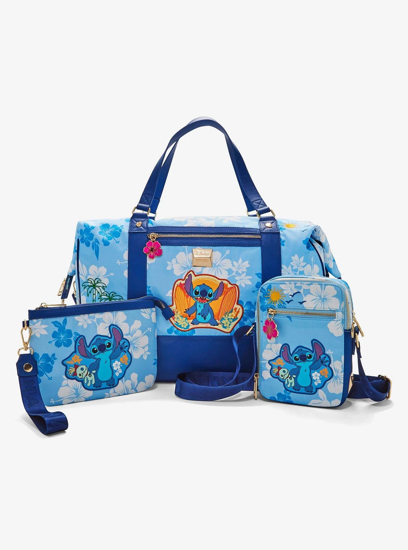Experiment with your look with this Lilo & Stitch duffle bag! With a hibiscus zipper pull and removable shoulder strap, this bag features an embroidered applique of Stitch amid surfboards, backed by a blue hibiscus print. Don’t miss the matching wristlet, crossbody, and backpack sold separately!